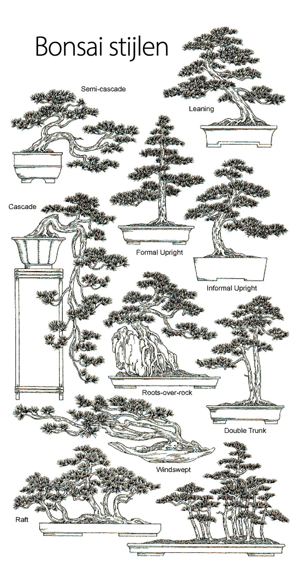 Bonsai kan verschillende vormen en stijlen> aannemen, afhankelijk van de manier waarop de boom wordt gesnoeid, gedraaid en geleid. De vormen en stijlen zijn vaak geïnspireerd door de natuurlijke groei van bomen in de natuur. Hieronder staan de meest populaire vormen van bonsai: