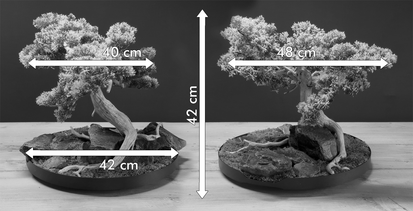 Deze bonsai is een ware eyecatcher voor uw kamer of kantoor. Hij groeit op een indrukwekkende rotspartij van Belgische zwarte lei, omgeven door ruwe mossen. De stam vertoont een karakteristieke structuur, en de boom heeft zich tussen de stenen doorgewrongen, De boom heeft zich gericht naar het daglicht – een populaire vorm in de bonsaikunst, bekend als 'golvende stam (Moyogi)'. Het gehele landschap is eenvoudig te draaien, aangezien het is bevestigd op een grote draaischijf met een zwarte metalen rand, die vrijwel geluidloos draait door middel van handbediening. Plaats deze bonsai in een vrije ruimte zodat de donkere stenen en de unieke stamstructuur optimaal tot hun recht komen.