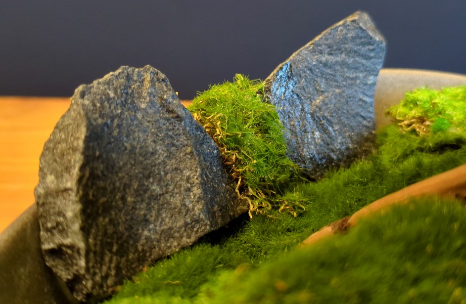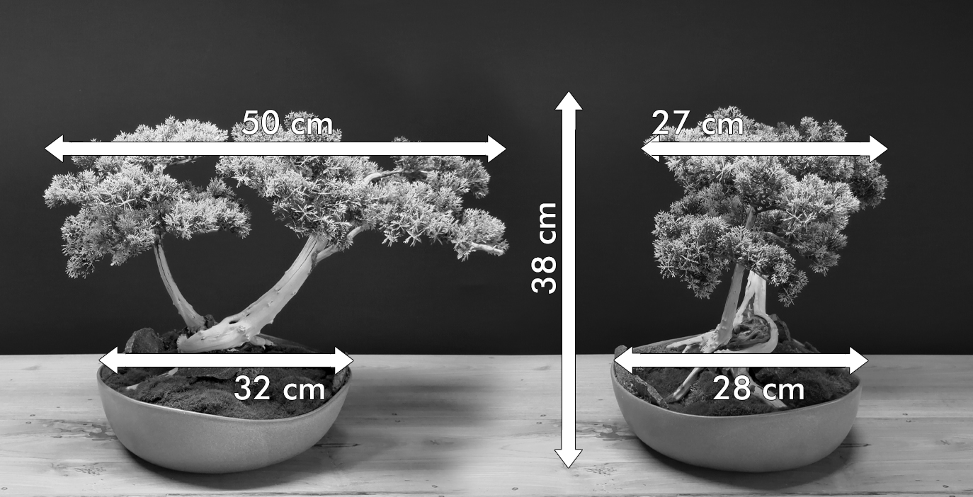 Deze bonsai bestaat uit twee stammen die samen één wortelsysteem delen, de z.g. Kabudachi bonsaistijl . De bonsai is gepositioneerd in een schaal, waarvan de bodem is bedekt met zowel fijnere als ruwe mossen. De schaal heeft een golvende rand, wat bijdraagt aan de organische uitstraling van het geheel. Meerstammige bonsais zijn zeldzaam en daardoor bijzonder opvallend. Het geheel is afgewerkt met kleinere brokken zwarte leisteen. Waar de meeste bonsai bomen wat meer ruimte vereisen, kan deze boom ook op een kleiner oppervlak worden geplaatst, zoals een vensterbank of boekenplank.