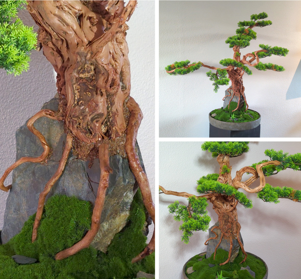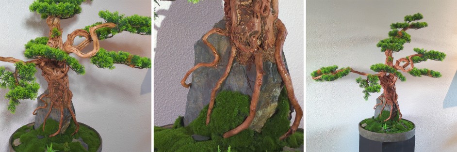 Beschikt u over een specifieke ruimte, zoals een nis in een kast of een unieke hoek in uw kantoor, en wilt u daar een bonsai laten plaatsen die perfect past? TreePetite biedt de mogelijkheid om een bonsai op maat te maken, tot een hoogte van ongeveer één meter, wat doorgaans de maximale hoogte is voor een bonsai. Wij kunnen tevens specifieke wensen verwerken, zoals bijv. het gebruik van uw eigen stenen. Of we creëren een specifieke vorm, bijvoorbeeld het cascade model, waarbij de bonsai in een watervalconfiguratie uit de pot naar beneden groeit. Onderstaand treft u enkele foto’s van een op maat gemaakte bonsai die wij naar de specifieke eisen van een klant hebben vervaardigd.